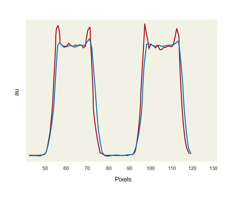 在像平面中可通过以下方式观察到相干效应:在如图4截面中所示的图像边缘上形成超调量。随着光源扩散角的增大,形成图像的光束的OPD也会增大,从而达到减少相干伪影的目的。可通过增大光源扩散角(例如插入扩散器)或增加光源带宽来减少相干伪影。图5对分别使用扩散器和宽带照明器减少超调量的效果进行了比较。