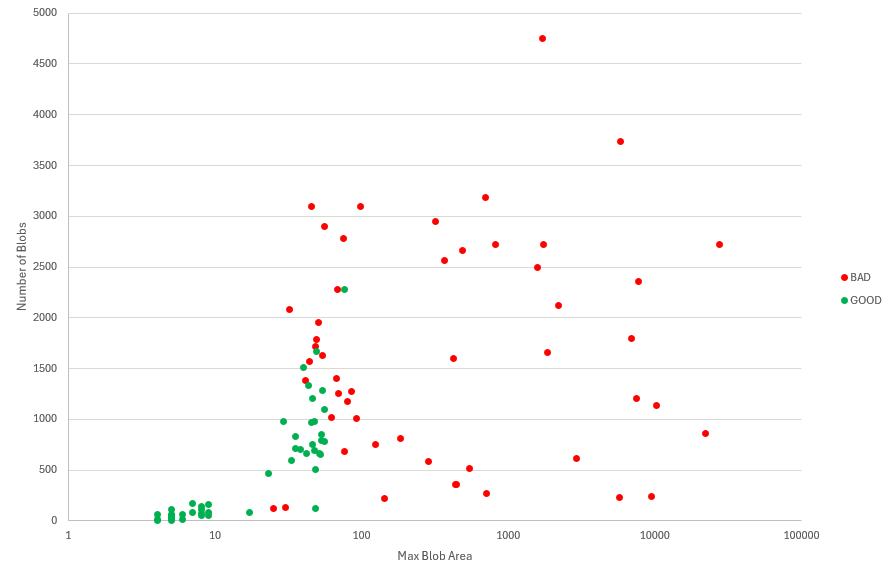 - Evaluation: Visualizing the features was very insightful. A plot of Maximum Blob Area vs Number of Blobs detected showed a clear separation: the OK parts formed a tight cluster at the origin (low variance, zero blobs), while the NOK parts were scattered further away with higher values for one or both features. This visual clustering confirmed that KNN was a suitable approach.
