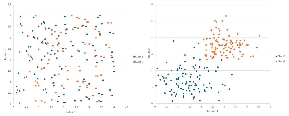 On the left an example of two features that are not useful for the classificatory, the graph representation shows that they are not distinctive. On the right an example of two distinctive feature, the graph representation clearly shows the two clusters.