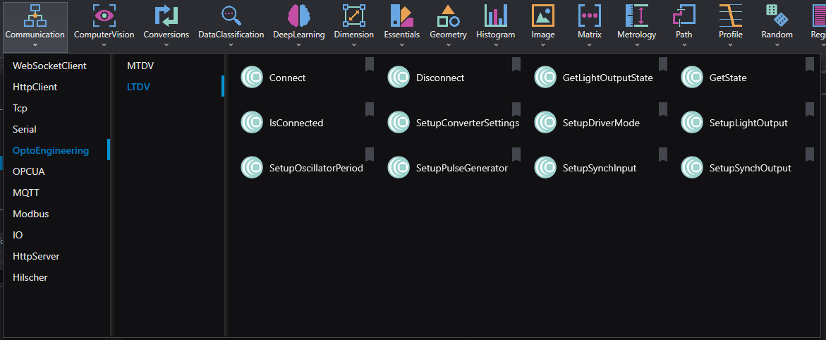 In OEVIS’s Job tab where you design the project, all the tools related to the LTDVE controller can be found in the tool library collection on the top bar, under Communication/Opto Engineering/LTDV.