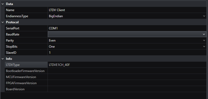 By clicking on the device, you can select the communication protocol choosing between either TCP or Serial. In both cases, on the right, you will see information about the device, and you can setup the communication.