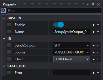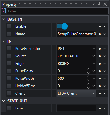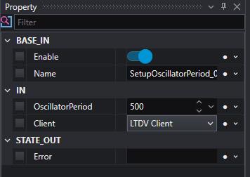 Using this logic, we are ready to start working with the controller. The first thing is to set the period of the internal oscillator. This will work as our internal master-clock, setting the “PG-signal” repetition rate. To do this let’s add the tool named SetupOscillatorPeriod. This tool requires as input the oscillator period, expressed in milliseconds, and the client name. The latter can be selected from a list of the connected devices; in this example, the client is named LTDV client.